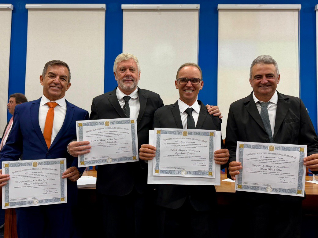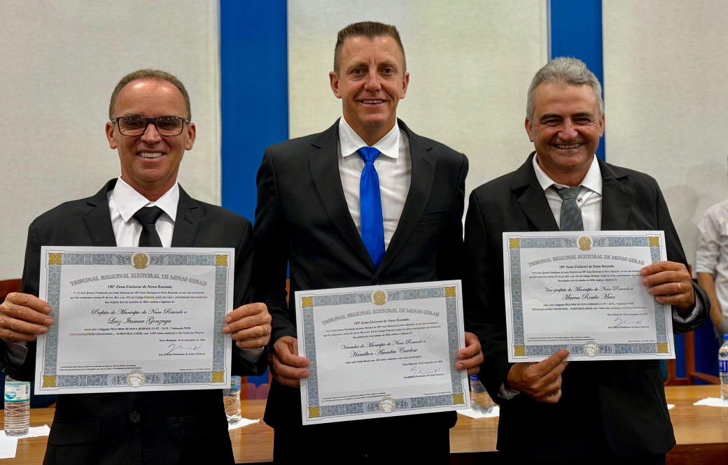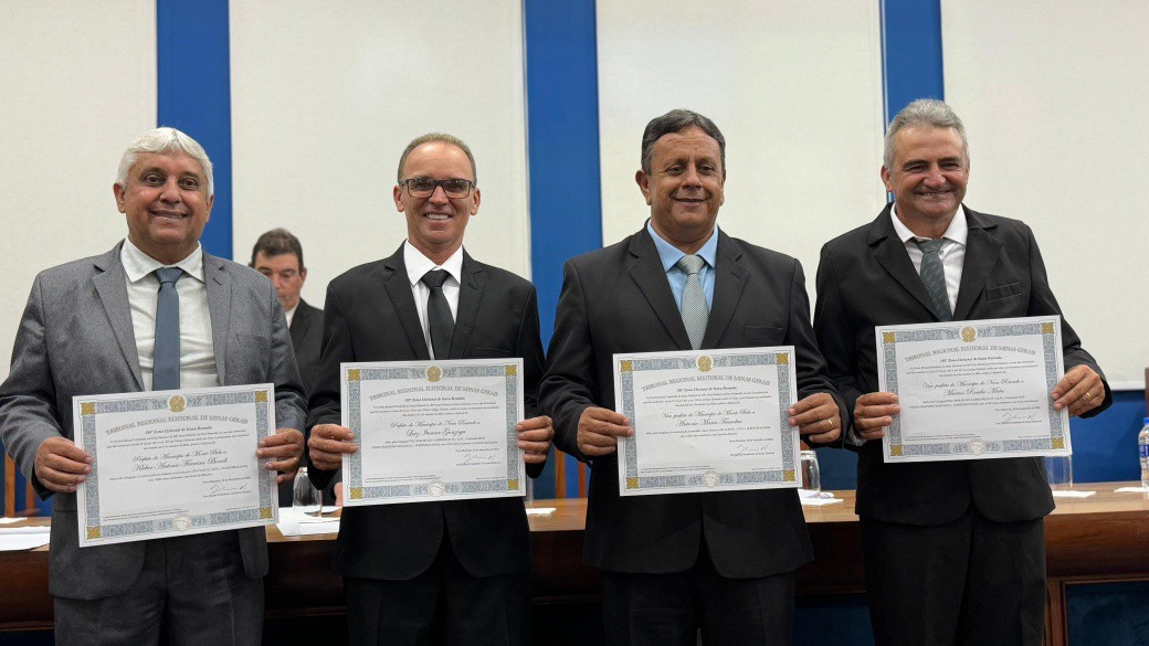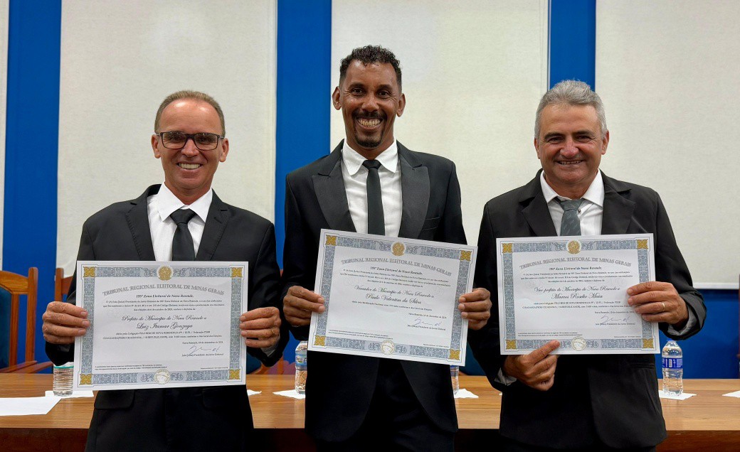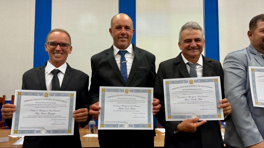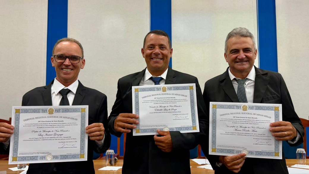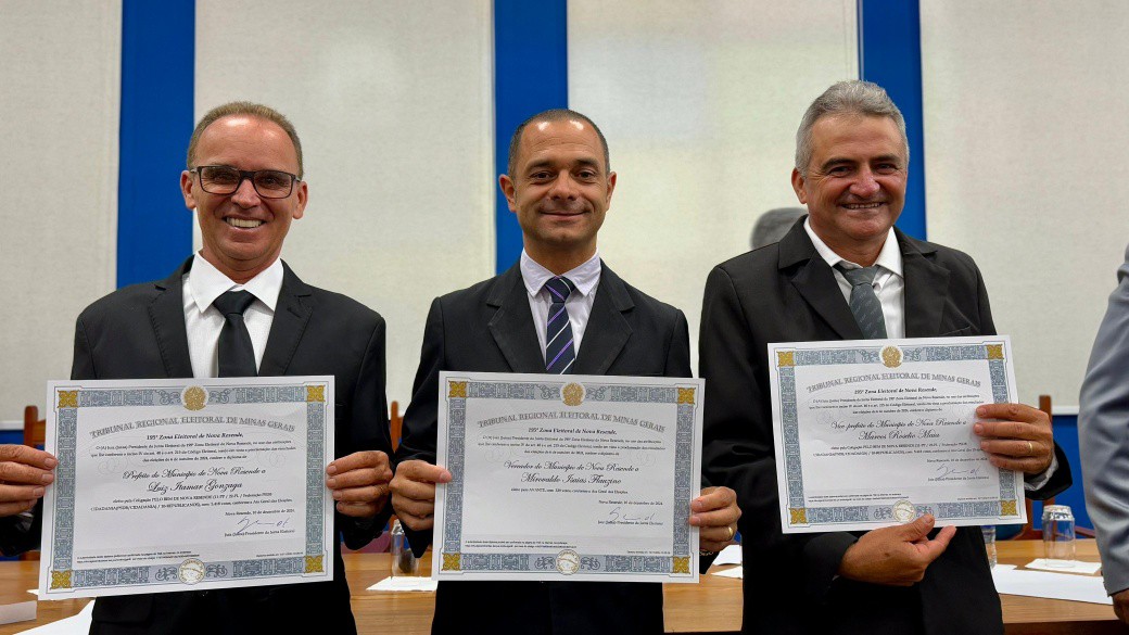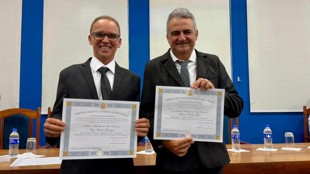 Finalizando os eleitos do município de Nova Resende, convidamos a se dirigirem à Mesa dos Diplomas os Senhores LUIZ ITAMAR GONZAGA e MARCOS ROSELIO MAIA, respectivamente Prefeito e Vice-Prefeito eleitos de Nova Resende no Pleito Municipal de 2024 pela Coligação PELO BEM DE NOVA RESENDE.