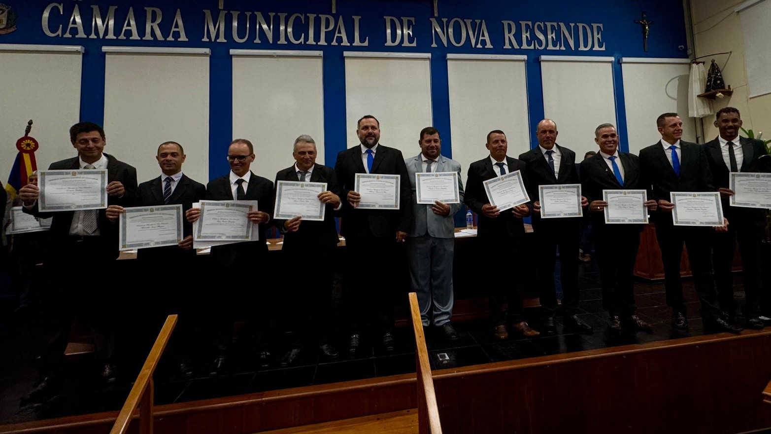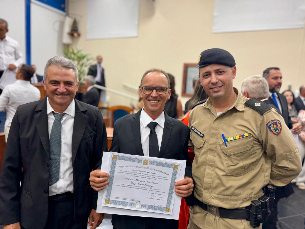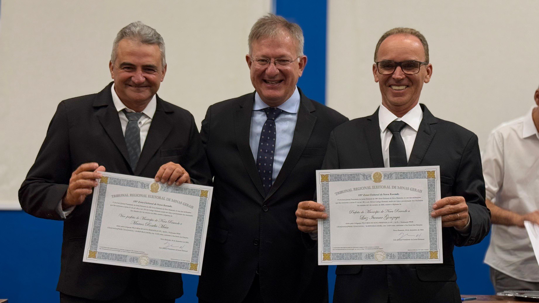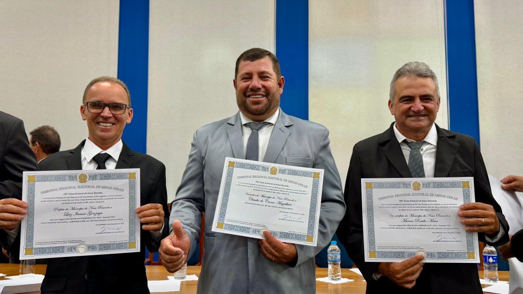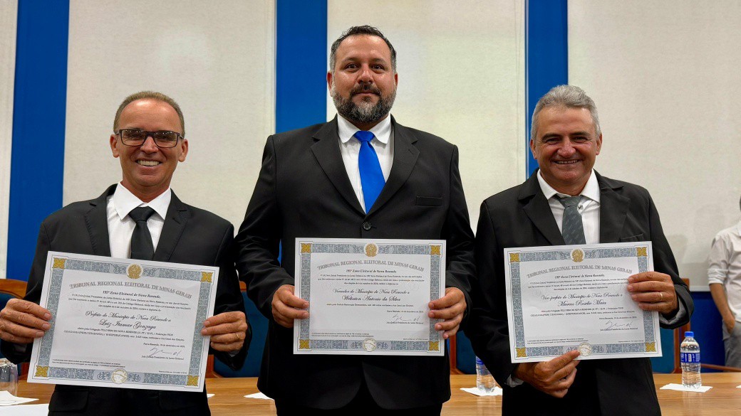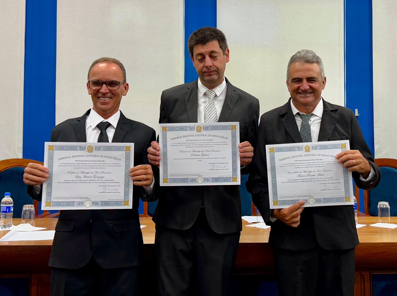 Finalizando os eleitos do município de Nova Resende, convidamos a se dirigirem à Mesa dos Diplomas os Senhores LUIZ ITAMAR GONZAGA e MARCOS ROSELIO MAIA, respectivamente Prefeito e Vice-Prefeito eleitos de Nova Resende no Pleito Municipal de 2024 pela Coligação PELO BEM DE NOVA RESENDE.